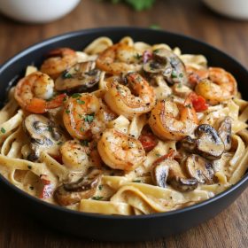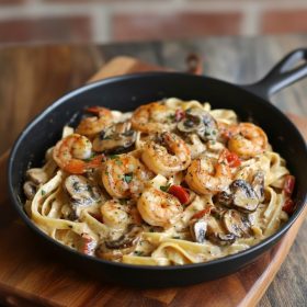 Blackened Shrimp Stroganoff is a creamy pasta dish featuring Cajun-spiced shrimp, sautéed mushrooms, roasted red peppers, and capers in a rich sour cream sauce served over tender fettuccini.