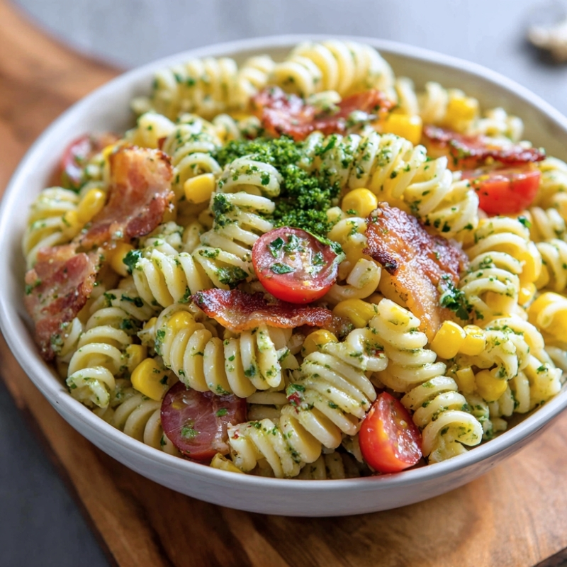 A light yet satisfying pasta salad made with sweet corn, crispy bacon, and a creamy pesto dressing, perfect for warm days or casual gatherings.