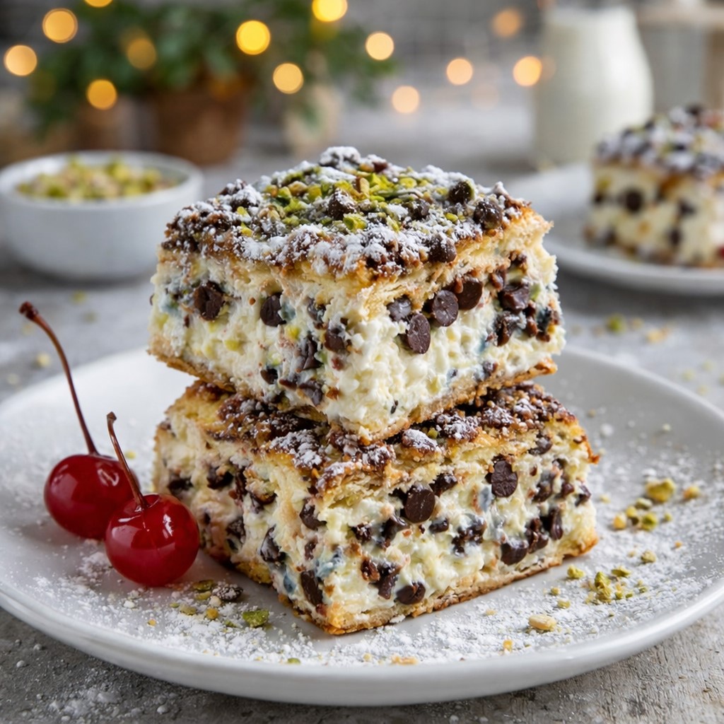 - Spoon cherry pie filling on top and gently swirl with a knife to create visible ribbons.