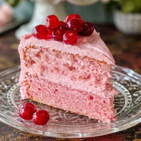 Cherry Blossom Dream Cake is a tender cherry flavored layer cake made with maraschino cherries, cherry juice, and a soft pink frosting. Lightly sweet and beautifully colored, it is ideal for spring gatherings and celebrations.