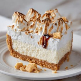 A creamy, no-bake cheesecake with marshmallow fluff and whipped topping for a soft, dreamy texture, layered on a buttery graham cracker crust. Perfect for holidays, celebrations, or simply treating yourself.