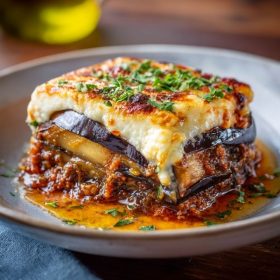 Greek Eggplant Moussaka is a hearty layered casserole featuring roasted eggplant, spiced meat sauce, and a silky béchamel topping. Rich, flavorful, and comforting, it’s a timeless Mediterranean classic perfect for family dinners or special gatherings.