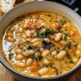 A Cozy Tuscan White Bean Soup simmered with vegetables, white wine, herbs, and broth until creamy, hearty, and full of comforting flavors.