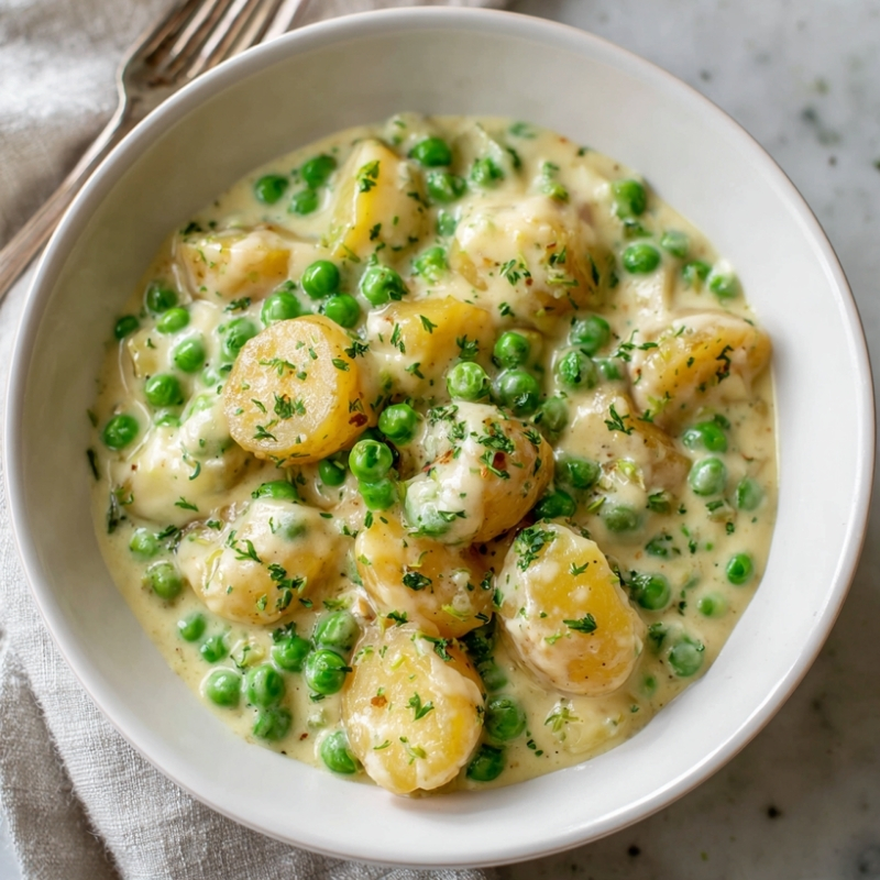 A creamy, comforting side dish made with tender potatoes, sweet peas, and a rich, lightly seasoned cream sauce—simple, hearty, and full of old-fashioned flavor.