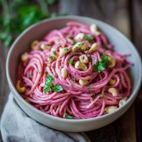 A creamy, plant-based pasta with a naturally vibrant pink sauce made from roasted beets and cashews—light, nourishing, and full of gentle flavor.