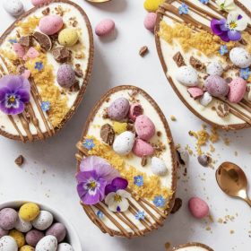 Easter Egg Cheesecake is a no bake dessert made inside hollow chocolate eggs, featuring a buttery cookie base, a light vanilla cheesecake filling, and festive Easter toppings.