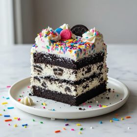 After assembly, the waiting begins. Hour by hour, curious noses hover near the refrigerator door, hoping time might hurry just this once. And then comes the moment of slicing, soft layers, creamy swirls, cheerful confetti colors, and that nostalgic Oreo comfort. For a breath or two, the kitchen always grows quiet. Joy settles gently around us, and the room feels full in the best way. This cake proves time and again that simple ingredients, a bit of patience, and a generous sprinkle of fun can turn everyday moments into sweet little celebrations.