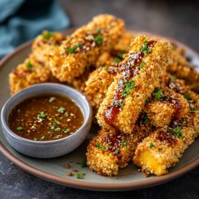 Crispy Honey Mustard Tofu Tenders are golden, oven-baked strips coated in a sweet and tangy glaze, finished with a crunchy breadcrumb crust—simple, satisfying, and lighter than traditional fried options.