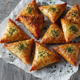 Preheat oven to 375°F (190°C). Place triangles on a parchment-lined baking sheet. Brush each lightly with melted butter or neutral oil. Bake for 20–25 minutes until golden and crisp. Garnish with dried mint or parsley flakes before serving.