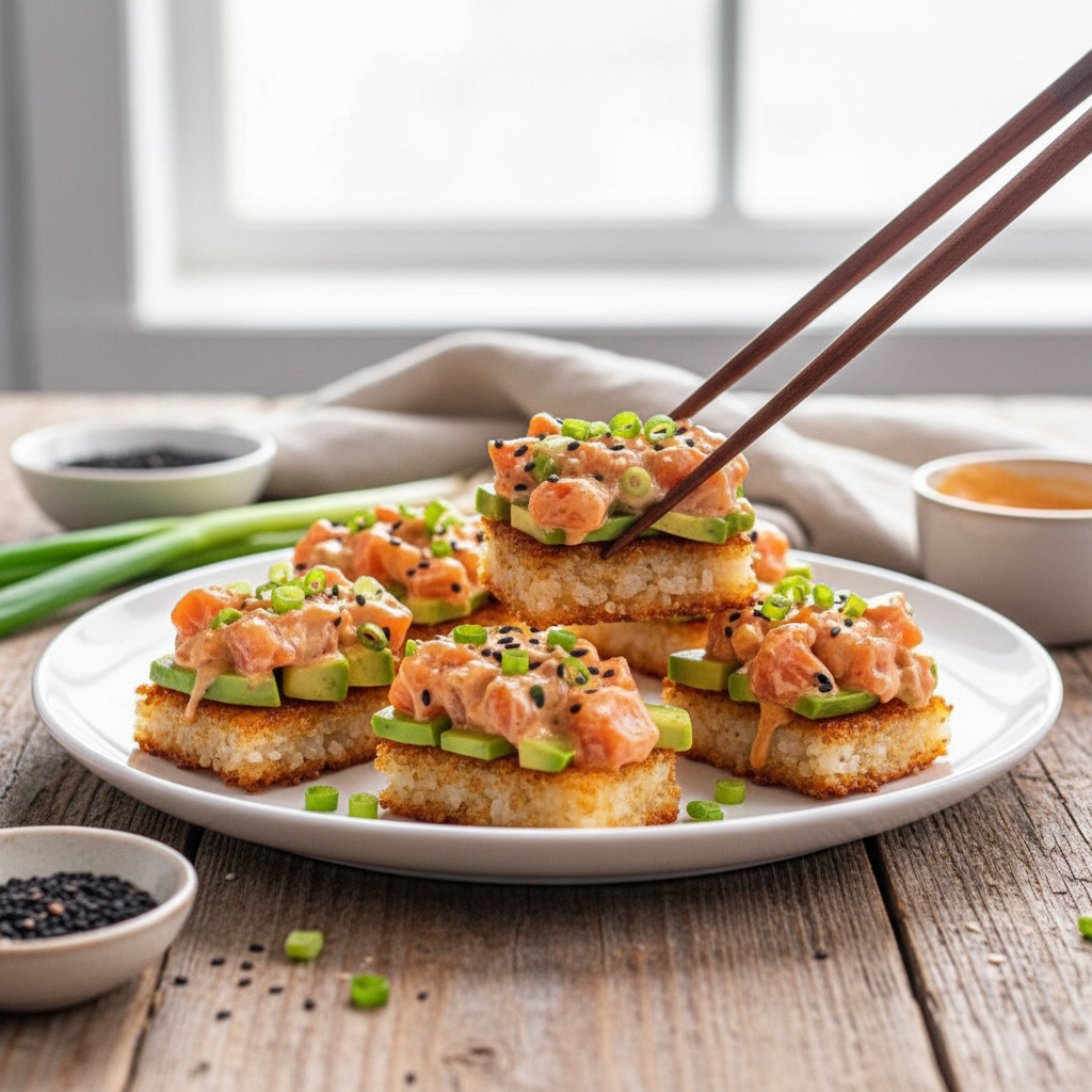 Crispy Salmon Rice Bites With A Perfect Crunch And Flavor are golden fried sushi rice cakes topped with creamy avocado and spicy salmon, offering crisp edges, tender centers, and bold, fresh flavor in every bite.