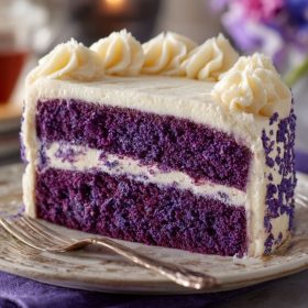 A soft, velvety purple cake with a delicate cocoa undertone, layered and covered in smooth, creamy vanilla frosting. Perfect for birthdays, parties, or any occasion that calls for a show-stopping, elegant dessert.