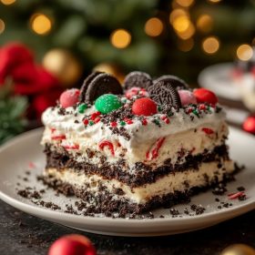 Top your lasagna with red and green M&M’s. You may scatter them randomly or arrange them in neat rows or holiday patterns. Add optional red and white sprinkles for extra colour. If desired, pipe small whipped-topping stars along the edges for a decorative border.