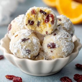 These Cranberry Orange Snowball Cookies are buttery, melt-in-your-mouth treats with bright citrus notes and sweet-tart cranberries. Lightly coated in powdered sugar, they make a perfect bite of holiday cheer.