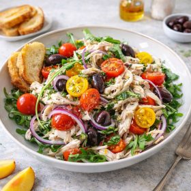 Italian Grinder Chicken Salad is a bold, deli-inspired main course packed with shredded chicken, cured meats, cheeses, crisp vegetables, and a tangy parmesan vinaigrette style dressing that delivers classic grinder flavor in every bite.