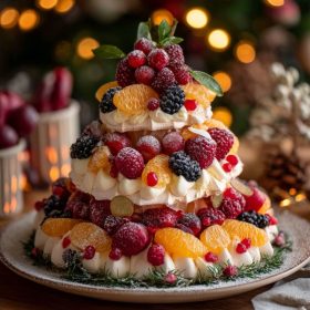 This magical pavlova Christmas tree is a stunning holiday centerpiece made of light, crisp meringue layers stacked with whipped cream and vibrant fresh fruits. It’s elegant, airy, and bursting with festive flavors.