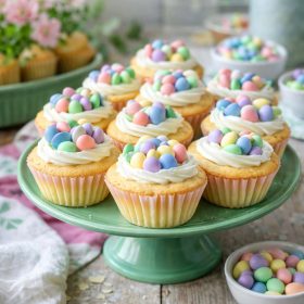 Top each frosted cookie cup with three candy eggs. Arrange them in a triangle shape to resemble a mini Easter basket.