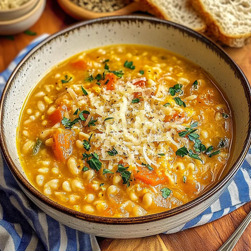 Ladle soup into bowls. Drizzle with olive oil, sprinkle with chopped parsley, and add Parmesan or a vegetarian alternative if desired. Serve hot.