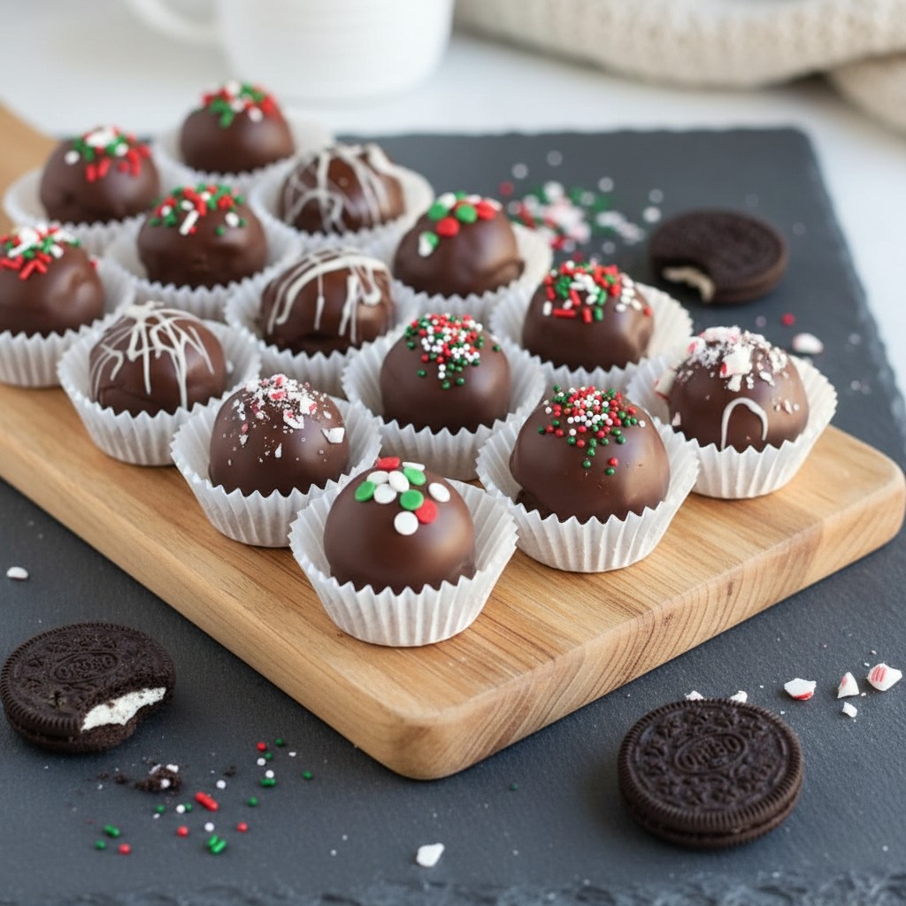 Easy Oreo Truffles are rich, creamy chocolate bites made with crushed Oreo cookies and cream cheese, dipped in dark chocolate and finished with festive toppings.