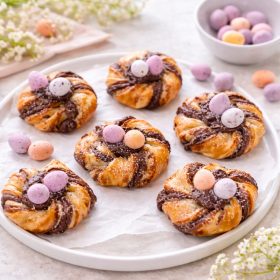 Flaky puff pastry spirals filled with Nutella and topped with mini eggs, creating a simple and festive Easter dessert.