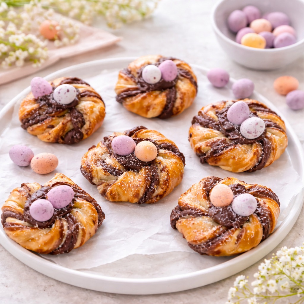 These pastry nests bring playful charm to spring gatherings and make dessert tables feel cheerful and bright. Their flaky texture and chocolate filling create a treat that looks impressive yet stays simple to prepare.