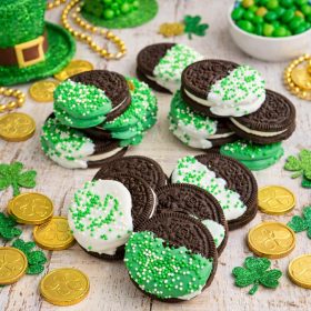 Festive St Patricks Day Oreo Treats are a quick no bake dessert made by dipping Oreo cookies into green and white chocolate and topping them with sprinkles. Crisp, creamy, and perfect for holiday platters or classroom treats.