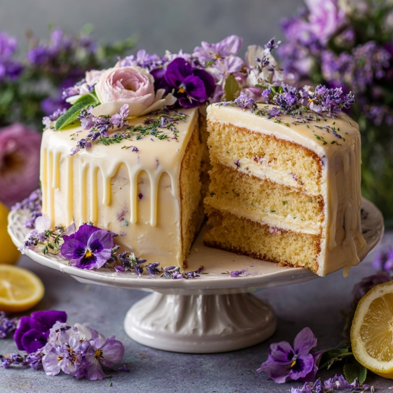 A light, citrusy cake infused with delicate lavender, layered with lemon buttercream, and finished with a soft floral glaze for an elegant, refreshing dessert.