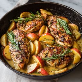 Tender chicken thighs are seared and roasted with apples, onions, and rosemary, then finished with a rich apple cider Dijon sauce. A perfect autumn meal that feels hearty and comforting.