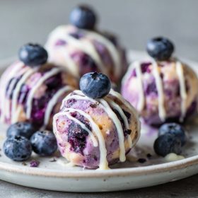 - Refrigerate the bites for 30 minutes to firm them up, then drizzle with glaze and top each with a fresh blueberry.