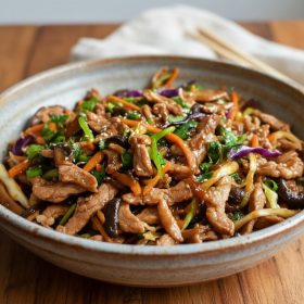Healthy Moo Shu Pork is a savory stir-fry of tender pork, crisp vegetables, and a flavorful hoisin-soy sauce mixture, served in warm tortillas or wrappers.