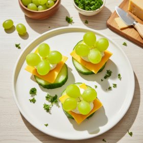 - Slice cucumbers to ¼ inch, cut cheese to match, halve grapes or tomatoes, and trim celery sticks or pretzel rods.