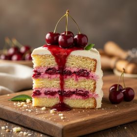 A slice of this cherry layer cake carries a quiet kind of joy, the sort that lingers long after dishes are washed and the table is cleared. Soft layers, gentle sweetness, and bright cherry moments come together in a way that feels perfect for both cheerful family gatherings and calm afternoons at home.