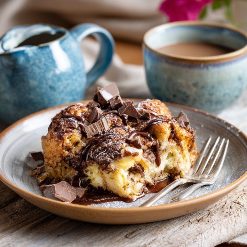 A rich and comforting Chocolate Croissant Breakfast Bake made with buttery croissants, creamy custard, and melty chocolate chips. Perfect for holidays, brunch, or any morning that deserves a little indulgence.