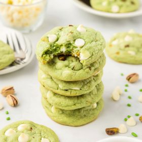 Pistachio Pudding Cookies are soft and chewy cookies with a subtle pistachio flavor, studded with white chocolate chips and chopped pistachios for a balanced, homemade treat.