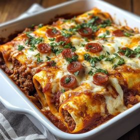 A hearty fusion dish combining bold pizza flavors with soft enchiladas, loaded with seasoned beef, pepperoni, creamy cheese, and baked until golden and bubbling.