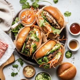 A flavorful Pork Banh Mi Burger made with seasoned ground pork, fresh herbs, crisp vegetables, and sriracha mayo, all served on toasted brioche buns for a satisfying and vibrant main dish.