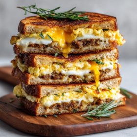 A hearty breakfast grilled cheese layered with fluffy eggs, savory sausage, and melty Colby Jack cheese, all tucked between crispy sourdough slices.