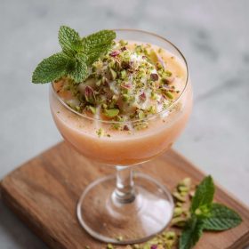 A light and refreshing dessert made with chilled cantaloupe, creamy coconut rose mixture, and a touch of cardamom, finished with pistachios and fresh mint.
