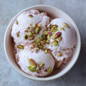 A silky rose pistachio ice cream with a delicate floral note, balanced sweetness, and a gentle crunch from roasted pistachios.