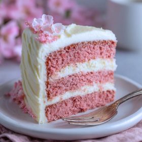 A soft and tender pink velvet cake with a delicate hint of cocoa, layered with creamy, tangy cream cheese frosting and finished with a charming blush color.