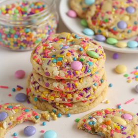 Easter Cookies are soft baked cookies made with spring M&M’s, white chocolate, and pastel sprinkles. Lightly crisp at the edges and tender in the center, they are perfect for Easter baking and sharing.