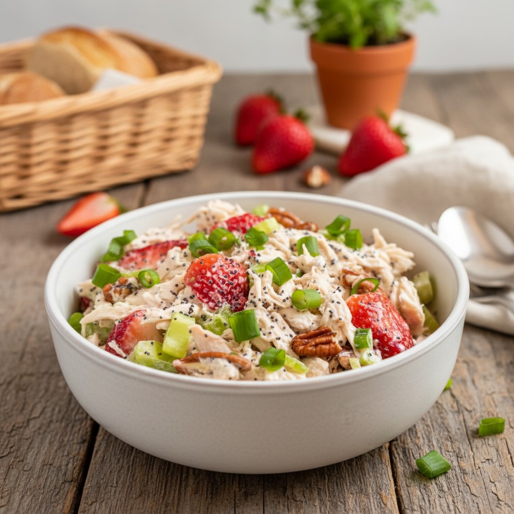 Preparing this salad brought a gentle sense of ease to the afternoon, the kind that comes when familiar ingredients come together with just a touch of creativity. The sweetness of the strawberries paired with the tender chicken made the kitchen feel lively, and the colors alone lifted the mood of everyone passing by.