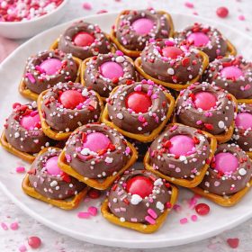 Remove the pan from the oven and gently press one M&M into the center of each softened Rolo. Sprinkle with Valentine’s sprinkles right away while the caramel is still warm.
