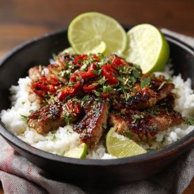 Tender pork infused with zesty lime and spicy ginger, served over creamy coconut rice. This dish strikes the perfect balance between sweet, savory, and tangy, with fresh herbs and peanuts adding a vibrant finish.