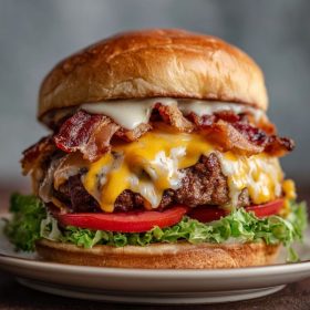 A hearty, juicy bacon cheeseburger made with perfectly seasoned beef patties, smoky crispy bacon, melty cheddar, and a tangy special sauce, all tucked into buttery toasted brioche buns.