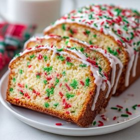 A soft, buttery buttermilk loaf dotted with festive red and green sprinkles, perfect for Christmas morning or holiday gatherings.