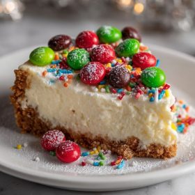 This Christmas Sugar Cookie Cheesecake combines a buttery cookie crust with a rich, creamy cheesecake filling, topped with festive red and green candies. It’s the perfect holiday dessert that’s both eye-catching and indulgent.