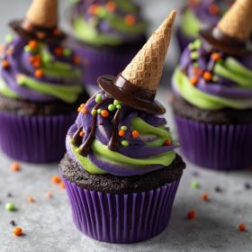 These whimsical Witch Hat Cupcakes are moist chocolate cupcakes topped with colorful frosting and crowned with a sugar cone “hat,” perfect for adding magic to Halloween parties or family gatherings.