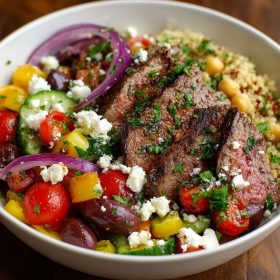 A wholesome and colorful dinner bowl featuring juicy grilled flank steak, fresh vegetables, quinoa or couscous, feta, and olives. Perfect for a balanced, flavorful meal any night of the week.
